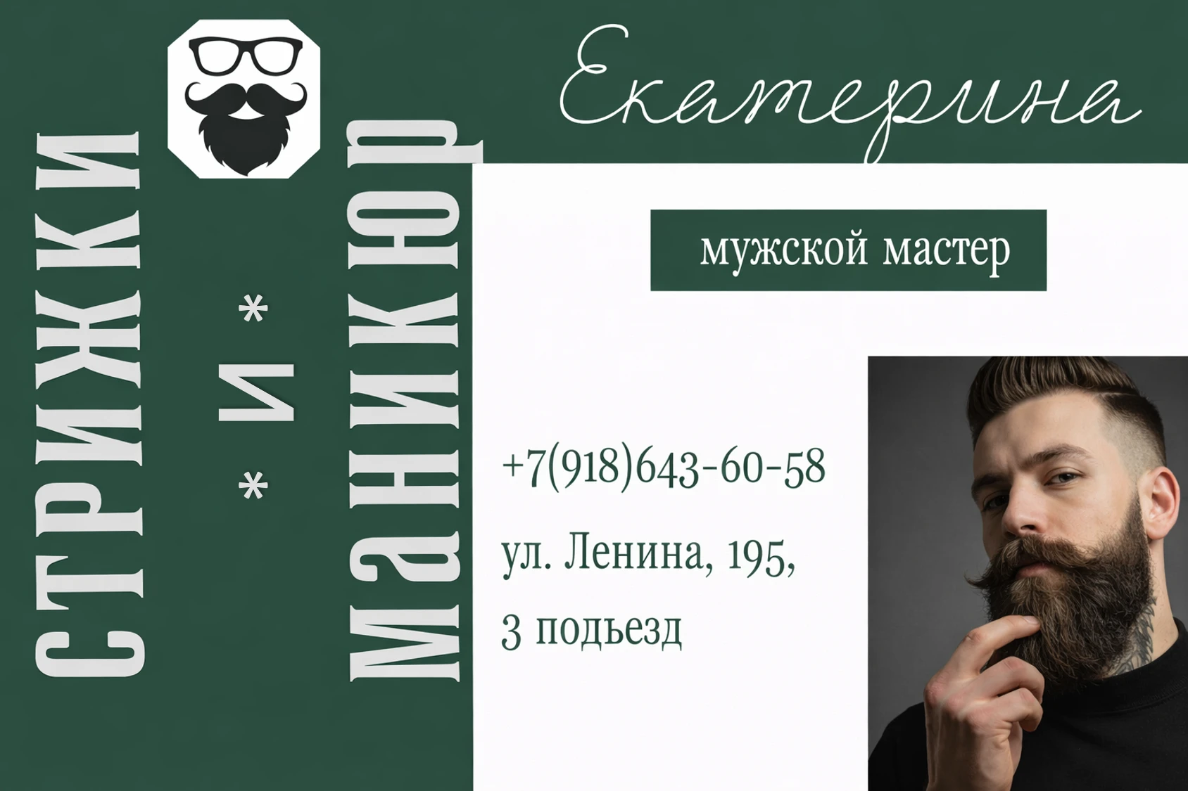 Екатерина — опытный парикмахер в Анапе. Работает в салоне красоты «Стрижки и маникюр» на улице Ленина 195. Специализируется на современных техниках и индивидуальном подходе к клиентам.